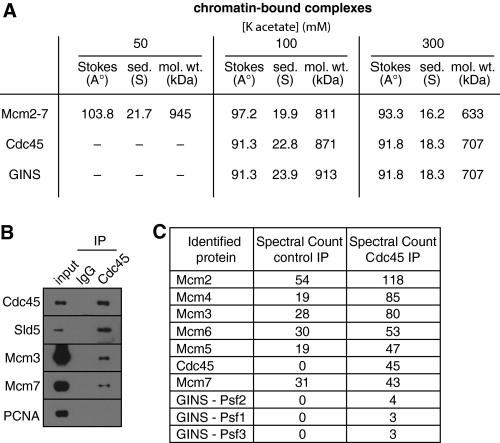 FIGURE 6. Xenopus CMG complex. Chromatin was isolated from egg extract in the middle of S-phase (when replisome proteins peak on chromatin), and proteins were released from chromatin in presence of 50, 100, or 300 mm potassium acetate. A, soluble chromatin protein complexes were separated by gel filtration and glycerol gradient and CMG components (Mcm2-7, Cdc45, and GINS) were followed through fractionation by immunoblotting. The data were used (19) to determine the molecular weight of the complexes. B and C, mid-S phase chromatin solubilized in 300 mm potassium acetate was immunoprecipitated with non-immune or anti-Cdc45 antibodies. Proteins present in the immunoprecipitates were analyzed by immunoblotting (B) or by mass spectrometry (C).