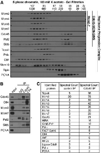 FIGURE 7. Behavior of other replisome proteins. Chromatin was isolated from egg extract in the middle of S-phase (when replisome proteins peak on chromatin) and proteins were released from chromatin in 100 mm potassium acetate. A, soluble chromatin protein complexes were separated by gel filtration and immunoblotted for a range of replisome proteins. B, mid-S phase chromatin solubilized in 100 mm potassium acetate was immunoprecipitated with non-immune, anti-Cdc45 or anti-Ctf4 antibodies. Proteins present in the immunoprecipitates were analyzed by immunoblotting. C, mid-S phase chromatin solubilized in 100 mm potassium acetate was immunoprecipitated with non-immune and anti-Cdc45 antibodies, and the precipitates were analyzed by mass spectrometry.