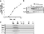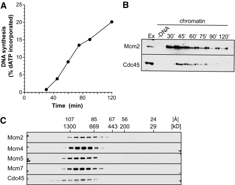 FIGURE 8. CMG complex at minimally licensed chromatin. Mcm3 depleted extract was supplemented with 10% of normal extract. A, DNA synthesis was assayed by α-[32P]dATP incorporation. B, chromatin was isolated at the indicated times and immunoblotted for Mcm2 and Cdc45 proteins. C, chromatin was isolated at 45 min and proteins were released from chromatin in 100 mm potassium acetate. Soluble chromatin protein complexes were separated by gel filtration and immunoblotted for the indicated proteins.