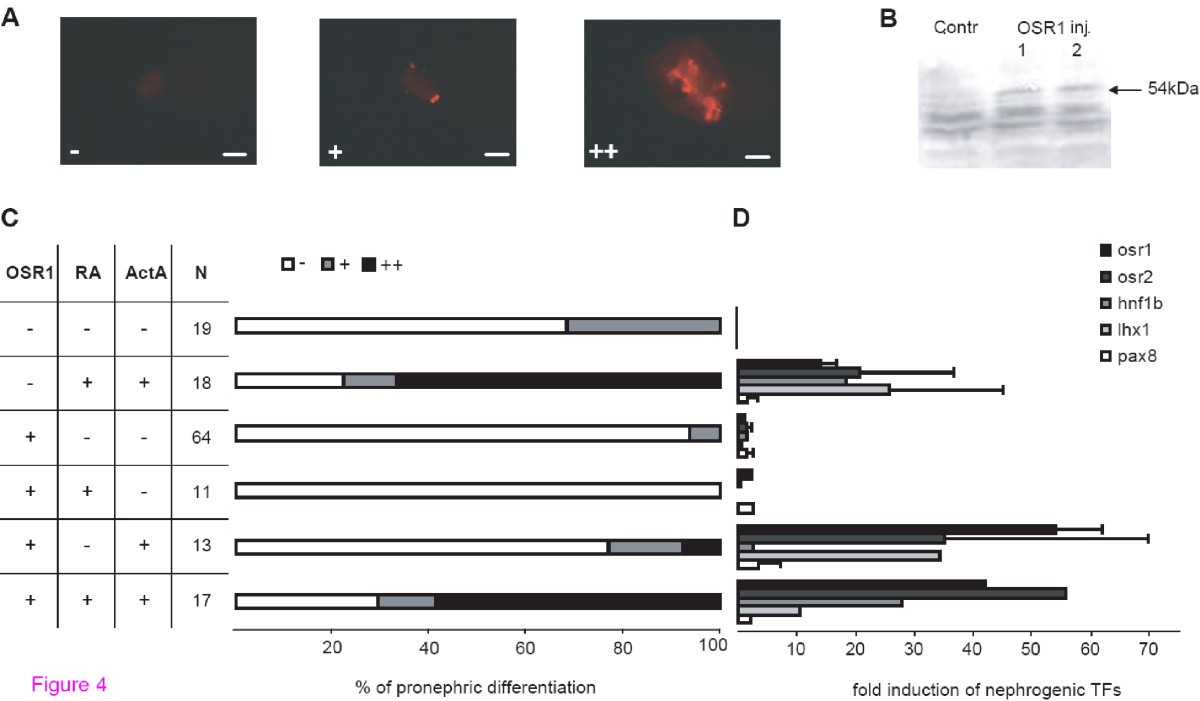 BACKGROUND: The three distinct types of kidneys, pronephros, mesonephros and metanephros, develop consecutively in vertebrates. The earliest form of embryonic kidney, the pronephros, is derived from intermediate mesoderm and the first expressed genes localized in the pronephros anlage are the transcription factors osr1, osr2, hnf1b, lhx1 and pax8, here referred to as the early nephrogenic transcription factors. However, the pathway inducing nephrogenesis and the network of theses factors are poorly understood. Treatment of the undifferentiated animal pole explant (animal cap) of Xenopus with activin A and retinoic acid induces pronephros formation providing a powerful tool to analyze key molecular events in nephrogenesis.