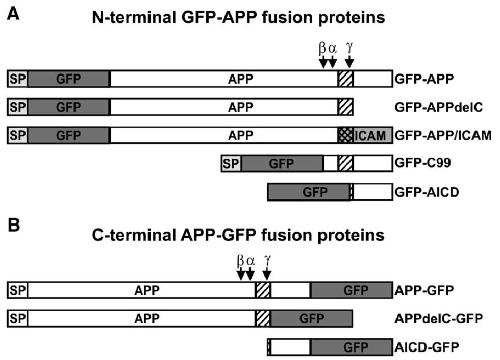 or C-terminal (B) GFP-fusion proteins of wild-type and mutant APP. Arrows indicate the β-, α- or γ-secretase processing sites
