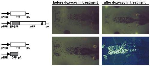 Fig. 3 – Inducible expression of GFP-APP in transgenic Xenopus. Fluorescent images of tadpoles microinjected in the first-cell