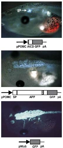 transgenic tadpoles after doxycyclin treatment (lower right panel). The transmembrane domain of APP is indicated by a dashed