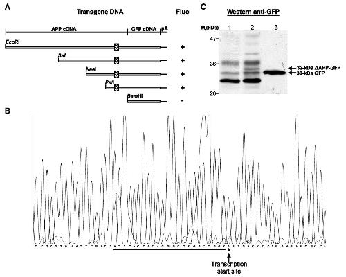 mutants of the APP-GFP construct were used in transgenesis and the generated animals were screened for fluorescence (fluo) in