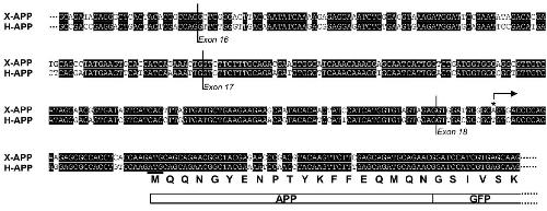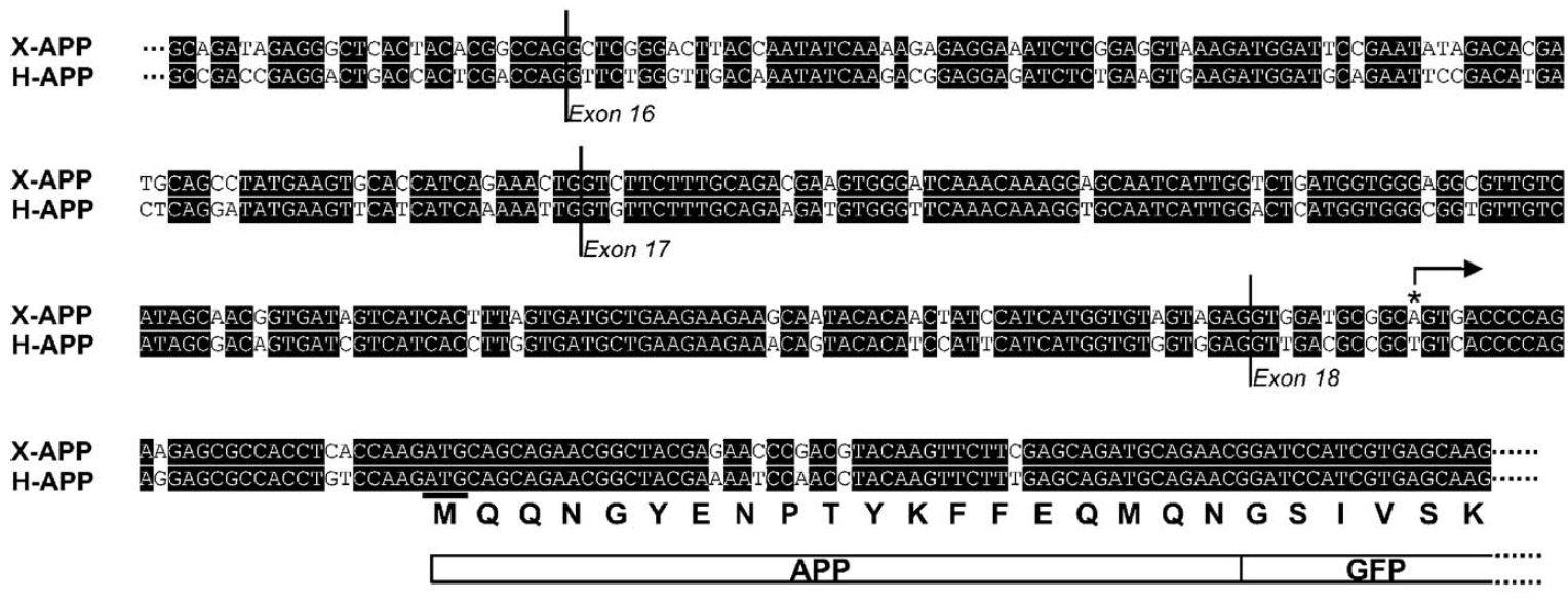 N-terminal region of the aberrant APP-GFP protein fragment is presented below the alignment. The positions of exons 16, 17