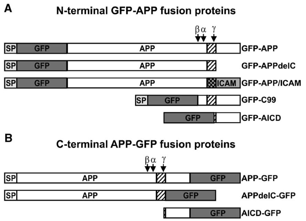 within APP. SP: signal peptide sequence; delC: mutant lacking the cytoplasmic tail of APP; ICAM TM/CT: mutant containing the