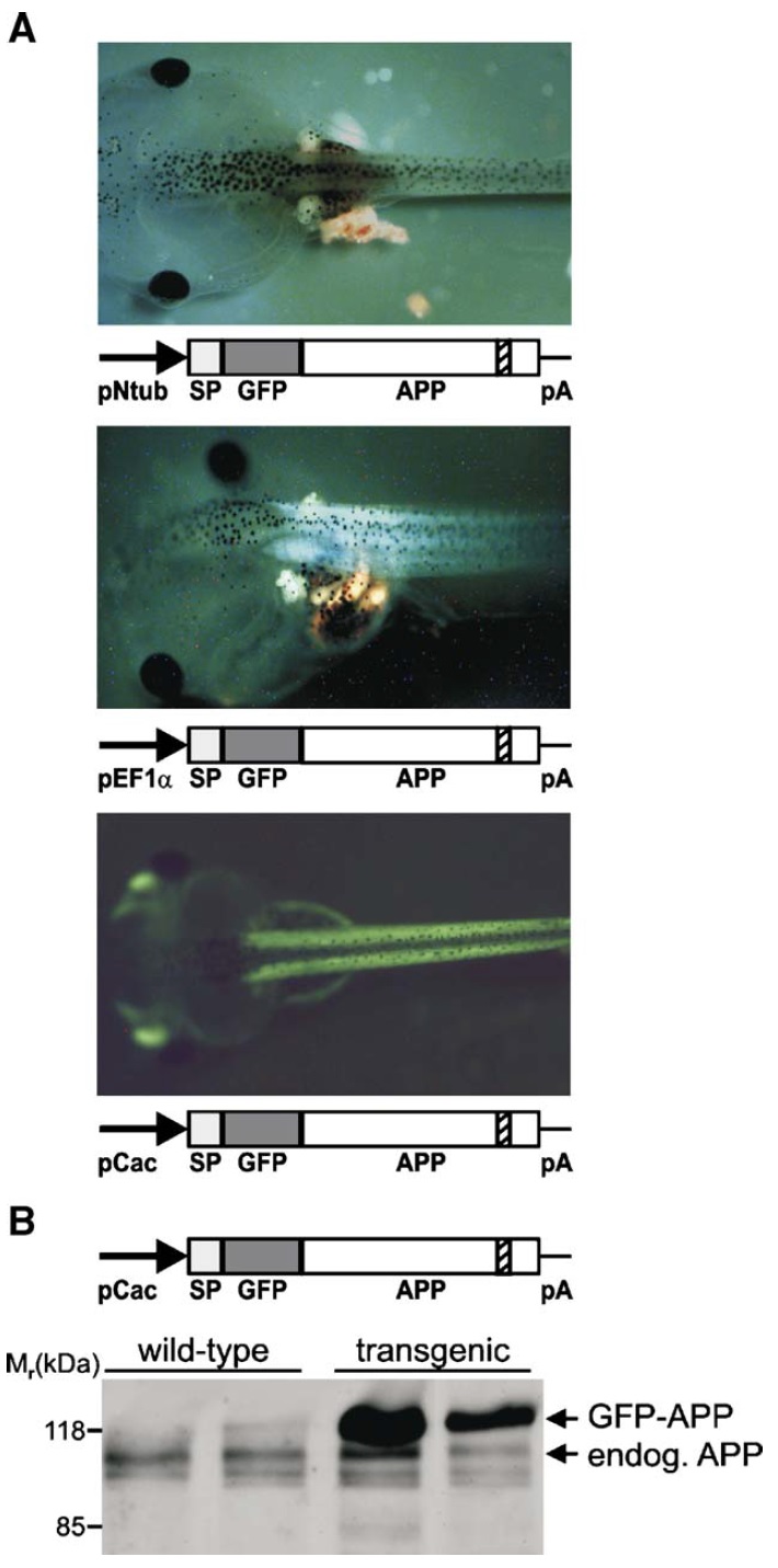 The amyloid-beta precursor protein APP is generally accepted to be involved in the pathology of Alzheimer's disease. Since its physiological role is still unclear, we decided to study the function of APP via stable transgenesis in the amphibian Xenopus laevis. However, the application of constructs encoding (mutant) APP fused to the C-terminus of the green fluorescent protein GFP (GFP-APP), and harboring a tissue-specific or an inducible gene promoter did not result in transgene expression of APP in neuronal and neuroendocrine cells. Surprisingly, a construct encoding either Xenopus or human APP fused to the N-terminus of GFP (APP-GFP) gave fluorescence throughout the whole brain of the tadpole, despite the fact that a proopiomelanocortin gene promoter was used to target transgene expression specifically to the intermediate pituitary cells. Detailed analysis with deletion mutants revealed the presence of a neural-specific, transcriptionally active DNA element within the 3'-end of the APP-coding sequence that gave rise to an aberrant transcript and protein in the APP-GFP transgenic animals. The DNA element appears to prevent proper APP transgene expression in Xenopus neuronal and neuroendocrine cells. Thus, the coding sequences of Xenopus and human APP contain a neural-specific promoter element, the physiological significance of which is at present unclear.