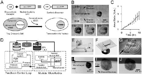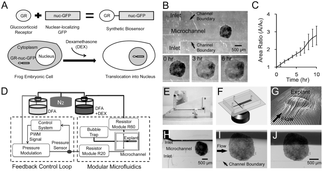 Figure 1. Spatiotemporal control of dexamethasone over Xenopus Animal Cap explants with the biosensor GR-nuc-GFP using a pressure feedback microfluidic approach.(A) Construction of DEX biosensor GR-nuc-GFP. GR-nuc-GFP resides in the cytoplasm, but moves into the nucleus after DEX is added. Dark areas in the cells indicate accumulation of GR-nuc-GFP. (B) Tissue explants from different frogs attached to the substrate in the microfluidic channels. Tissue explants spreading at the begining (left panel), 3 hours (middle panel), and 6 hours (right panel) after attachment in the microfluidic channel. (C) Ratio of the area of the tissue explants normalized by the initial area versus time (n = 3). Error bars represent standard deviations. (D) Microfluidic interface control system consisting of feedback control loop and modular microfluidics (see Materials and Methods). (E) Pressure modulation mechanism that allows long-term and high-speed control of the flow rate in a microfluidic channel [28]. (F) Schematic showing the confocal microscopic imaging of the cross-typed microfluidic channel. (G) Simulations showing flow pathlines over and around a single explant through a Computational Fluid Dynamics (CFD) simulation indicating no flow disruption around the explant. (H) Laminar flow interface between the stream of DEX (upper inlet; black) and the stream DFA (lower inlet) before the experiment. (I) Regulated laminar flow interface covers quarter of the AC explant. (J) Laminar flow interface moves to the center of the channel, exposing DEX to the half of the AC explant.