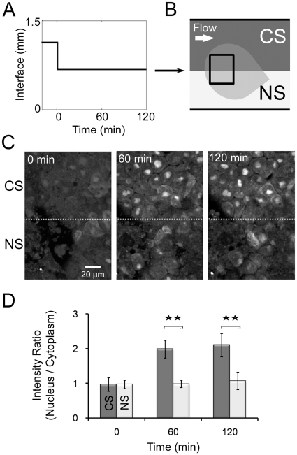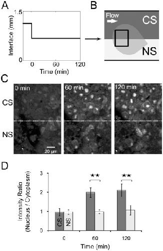 Figure 2. Localized response to spatially defined continuous stimulation.(A) Laminar flow interface profile over time. (B) Schematic depicting two regions within a single AC explant subject to different stimulation conditions: constant stimulation (CS; upper region; DEX & DFA) and no stimulation (NS; lower region; DFA). (C) Images of the explant subjected to CS and NS depicted in (B) at the beginning (left), 60 minutes (middle), and 120 minutes (right). The dotted line marks the interface, which correlates to the line between CS and NS regions in (B). (D) Intensity ratios of GFP levels in nucleus relative to cytoplasm. Error bars represent standard deviations for 20 cells (** indicates p<0.01). Variable expression of GR-nuc-GFP biosensor across the animal cap is due to the uneven inheritance of mRNA encoding GR-nuc-GFP into 1 or 2-cell stage embryo.