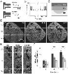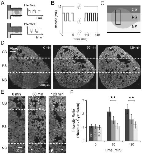 Figure 3. Localized responses to spatiotemporal periodic stimulations with 50% duty cycles.(A) The stream of DEX is controlled by directing a laminar flow interface over the explant allowing periodic stimulation profiles to be applied. Circles on the top of the periodic pattern of the interface represent initial interface positions while squares on the bottom of the pattern indicate repositioned interfaces. (B) Laminar flow interface profile over time. (C) Schematic depicting three regions of a single AC explant exposed to different stimulation conditions: CS (upper region), 2-minute 50% duty cycle PS (middle), and NS (lower). (D) AC explants exposed to CS, PS, and NS regions of (C) at 0 minutes (left), 60 minutes (middle), and 120 minutes (right). The dotted lines mark the interfaces, which correlate to the lines between CS, PS, and NS regions in (C). (E) High resolution views of explants shown in (D) in the area indicated by the rectangular shape in (C) at the beginning (left), 60 minutes (middle), and 120 minutes (right). The dotted lines represent the interfaces, which correlate to the lines between CS, PS, and NS regions in (C) and (D). (F) Intensity ratios of GFP in the nucleus versus cytoplasmic intensities. Error bars represent standard deviations for 20 cells (** indicates p<0.01). Variable expression of GR-nuc-GFP biosensor across the animal cap is due to the uneven inheritance of mRNA encoding GR-nuc-GFP into 1 or 2-cell stage embryo.