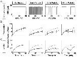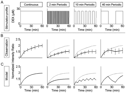 Figure 4. Responses of the tissue explant to four different stimulation profiles: continuous stimulation (CS), and 50% duty cycle periodic stimulation (PS); 2 min-, 10 min-, and 40 min-period.(A) Input stimulation profiles. (B) Responses of 30 individual tracked cells from 3 different tissue explants to four different stimulation cases with different duty cycles: CS, 2-minute 50% duty cycle PS, 10-minute 50% duty cycle PS, and 40-minute 50% duty cycle PS. Error bars indicate standard deviations. Dotted lines represent the response to CS (left panel). (C) Mathematical model recapitulated GR-nuc-GFP movements after various periodic stimulation profiles. This model was constructed using a first-order differential equation (see Materials and Methods). The parameters reproducing the response to CS were applied to the other PS cases to predict their response without any additional parameters (modeled CS; modeled 2-minute PS; modeled 10-minute PS; and modeled 40-minute PS). Dotted lines represent the modeled response to CS (left panel). The modeled results well approximate experimental results in (B).
