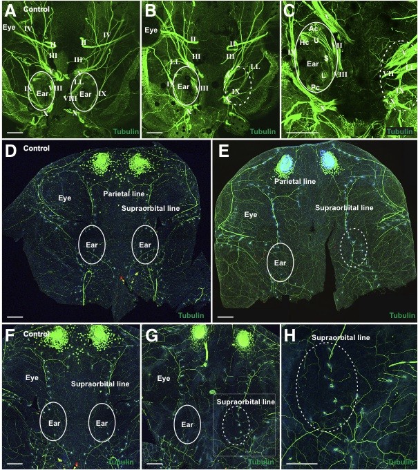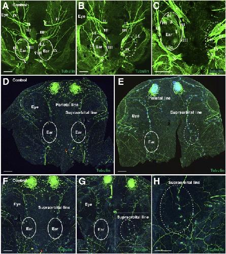 Fig. 4. Development of cranial and lateral line nerves. Acetylated tubulin immunostaining of cranial nerves in a control embryo (A) and in embryos in which the ear was transplanted (B,C). (D) Acetylated tubulin (green) immunostaining of lateral line nerves in the cranial skin of a control embryo (E) Acetylated tubulin (green) and Hoechst (blue) immunostaining of a later-stage transplanted embryo. Acetylated tubulin (green) immunostaining of lateral line nerves in the cranial skin of a control embryo (F) and an embryo in which the ear was transplanted (G). (H) Higher magnification of boxed area in E. Areas where native ears are present and where ablated ears had occupied are circled with solid and dotted lines, respec- tively. Native ears are labeled ar Eyes (A,B) and skin over the eyes (D,E,F,G) are labeled ye Cranial nerves are labeled with Roman Numerals. LL, lateral line; U, utricle; S, saccule; L, lagena; Ac, anterior canal; Hc, horizontal canal; Pc, posterior canal. Scale bar is 250 ïm.