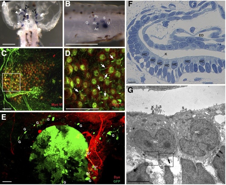 Fig. 2. Development of the transplanted ear. (A) MiR-183 in sensory epithelia in the native ear and in surrounding cranial ganglia as well as ganglia next to the ablated ear (i.e. Trigeminal ganglia, V). (B) Lateral view of the transplanted ear with miR-183 positive sensory epithelia and ganglion cells; anterior is to the right. (C) Acety- lated tubulin (green) and MyoVI (red) immunostaining of a transplanted ear showing hair cells. (D) Magnification of region in C show kinocilia (white arrows) on hair cells. (E) Green fluorescent protein (GFP)-labeled transplanted ear reveals GFP-positive delaminating sensory ganglion cells (G), a few of which (G*) are colocalized with lipophilic dye (red). Lipophilic dye injections were ventral to the spinal cord. (F) 2 ïm thick transverse section through the dorsal and lateral view of transplanted ear show- ing a sensory epithelium with hair cells and an endolymphatic duct. (G) Transmission electron micrograph of two hair cells in the transplanted ear with synaptic ribbons (black arrows). The boxed areas are shown at higher magnification in Fig. 3 K,L. U, utricle; S, saccule; Ac, anterior canal crista; Hc, horizontal canal crista; Pc, posterior canal crista; G, ganglion cell(s); HC, hair cells K, kinocilium; S, stereocilia; ED, endolymphatic duct. Scale bar is 0.5 mm in (A,B); 25 um in (C,D); 50 um in (E), 0.1 mm in (E inset); 10 um in (F) and 5 um in (G)
