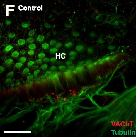 Fig. 3. Afferent and efferent innervation of transplanted ears. (A) Transplanted ear that had dextran amine (red) injected into the spinal cord. Autofluorescence of the tissue is green. Inset: higher magnification of boxed area. (B) Transplanted ear that had lipophilic dyes injected into the spinal cord rostral (red) and caudal (green) to the ear. (C) Acetylated tubulin immunostaining (red) of boxed area in B showing ganglion cells apposed to hair cells. Autofluorescence of the tissue is green. (D) Cells in the ventral spinal cord positive for dextran amine dyes that had been injected into the transplanted ear. (E) Neuromasts in the skin showing vesicular acetylcholine transporter (VAChT)-positive terminals on the hair cells. Autofluorescence is blue. (F) Hair cells in a control ear immunostained for acetylated tubulin and VAChT. (G) Transplanted ear that had lipophilic dye injected ventral to the spinal cord show nerve fibers extending to the ear. (H) Transplanted ear in G immunostained for acetylated tubulin. (I) Transplanted ear in G immunostained for acetylated tubulin and VAChT. Inset: higher magnification of boxed area. Red arrows indicate VAChT immunostaining. (J) Transplanted ear immunostained for acetylated tubulin and VAChT. Inset: single optical section of VAChT staining (red arrows) at the base of hair cells. (K) Electron micrograph of an afferent terminal on a hair cell. A synaptic ribbon (arrow) is observed on the hair cell above the afferent terminal (L) Electron micrograph of an efferent terminal with vesicles (circled) making a synapse on a hair cell. These TEM images were obtained from ears previously processed for immunohis- tochemistry to confirm the presence of VAChT, hence poor preservation of membranes. GC, ganglion cell; HC, hair cell; MN, motor neuron cell body; NM, neuromasts; Aff, afferent terminal; Eff, efferent terminal; V, vesicles; Mt, mitochondria. Scale bar is 100 um in (A,B,C,D,G,H); 25 um in (E,F,I,J) and 1 um in (K,L).