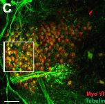 myo6 (myosin VI) gene expression (in red) in sections of Xenopus laevis embryos, NF stage 46, as assayed by immunohistochemistry.