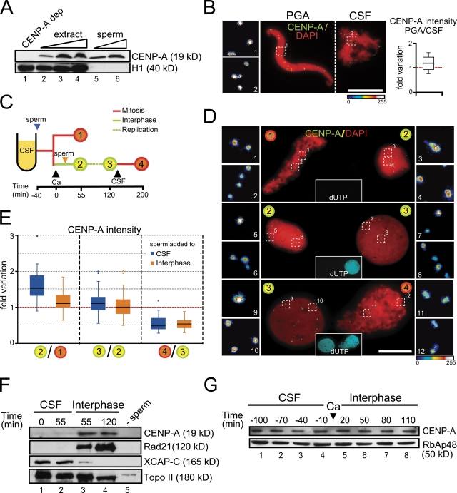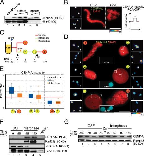 Figure 1. CENP-A deposition occurs in early interphase in Xenopus egg extracts. (A) Sperm nuclei contain CENP-A. Immunoblot analysis of increasing amounts of egg extract (1, 2, and 3 µl; lanes 2–4), 3 × 105 and 6 × 105 sperm nuclei (lanes 5 and 6), and 1 µl of an extract depleted of CENP-A as control (lane 1). Unlike CENP-A, histone H1 is present in the soluble extract but not in the sperm nuclei. (B) Sperm nuclei were incubated with a buffer containing polyglutamic acid (PGA) or in CSF extract, mixed, centrifuged on the same coverslip, stained with anti-CENP-A (green) and DAPI (red), and imaged together. One representative pair of nuclei is shown. Bar, 10 µm. In the blown-up images on the left the intensity of the CENP-A labeling has been coded with a color gradient going from blue (minimum) to white (maximum). The intensity of CENP-A signals was measured for 15 pairs of nuclei and plotted as fold variation of the average signal for each pair. (C) Outline of the chromatin assembly experiment and the time points at which samples were taken for analysis. The time of calcium addition is considered t = 0. Black arrowheads indicate additions to the extract. The blue and orange arrowheads indicate the time of sperm addition in the two different experiments described in the main text. (D) Representative images of pairs of nuclei from two consecutive time points of the assembly reaction processed and analyzed together. Nuclei were stained with CENP-A (green) and DAPI (red). Replication was visualized by incorporation of biotin-dUTP (cyan, insets in the center). Bar, 10 µm. (E) Graph showing the fold variation of CENP-A signal intensities between two given time points (indicated by the numbers as in panel C) for two different time course experiments: blue boxes for the experiment in which sperm is added to CSF extract and orange boxes for addition of sperm in interphase extract. Data for each time point come from 15 pairs of nuclei in at least two independent experiments. (F) Immunoblot analysis of chromatin fractions obtained after incubation of sperm nuclei in CSF extract (lanes 1 and 2) or incubated in CSF for 40 min and then driven in interphase by addition of calcium (lanes 3 and 4). The times indicated correspond to the scheme in panel C. A mock assembly reaction without sperm DNA is shown as control (lane 5). (G) Immunoblot analysis of samples taken from an egg extract at the indicated times. The time of calcium addition is considered t = 0. The histone chaperone RbAp48 is shown as loading control. |