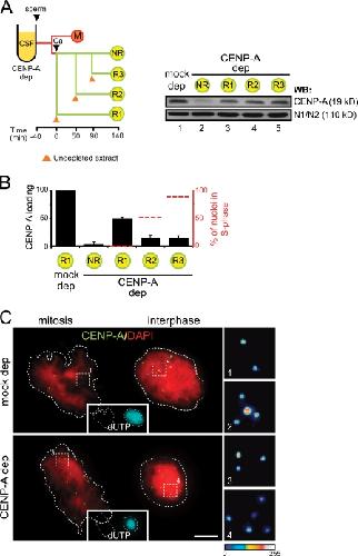 Figure 2. A window of opportunity for CENP-A loading in early interphase. (A) Outline of the chromatin assembly experiment (left) and immunoblot analysis of total extracts to show soluble CENP-A levels under the indicated conditions (right). The histone binding protein N1/N2 is shown as loading control. Sperm was added at t = 0 to CSF extracts (mock depleted or CENP-A depleted). For the mock-depleted extract, one-half volume of undepleted interphase extract was added at the time of calcium addition. For the CENP-Aâdepleted extract, either no extract was added back (no rescue [NR] condition) or one-half volume of undepleted interphase extract was added at the times indicated (R1, R2, and R3). (B) Bar graph showing the CENP-A loading efficiency under the conditions explained above, with respect to the mock-depleted extract. A small sample of the assembly mixture was taken right before addition of undepleted extract to check the percentage of nuclei showing some incorporation of biotin-dUTP (i.e., undergoing replication, red dotted line) at the time of restoring CENP-A availability, although analysis of CENP-A incorporation was performed comparing CENP-A signals from fully replicated interphase nuclei (taken at t = 140 min) and mitotic chromosomes from images such as those shown in C. At least 15 pairs of nuclei were measured for each condition. Bars represent mean ± SE. (C) Representative images of a mass of mitotic chromosomes next to a replicated interphase nuclei stained with anti-CENP-A (green) and DAPI (red) taken from the mock-depleted (top) and CENP-Aâdepleted (bottom) samples. Replication was visualized by incorporation of biotin-dUTP (cyan). Bar, 10 µm. |
