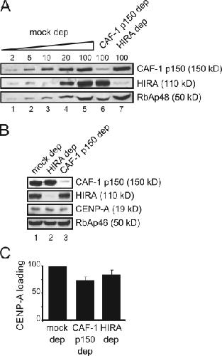 Figure 3. CENP-A incorporation in CAF-1 p150â and HIRA-depleted extracts. (A) Immunoblot analysis of increasing amounts of a mock-depleted extract (expressed as percentage of a 1.5-µl aliquot) and 1.5-µl aliquots of CAF-1 p150â and HIRA-depleted extracts with the indicated antibodies. RbAp48 levels are also shown. (B) Immunoblot analysis of aliquots from a mock-depleted extract, HIRA- and CAF-1 p150âdepleted extracts to show the remaining levels of CENP-A. RbAp46 levels are also shown. (C) Bar graph showing the CENP-A loading efficiency in the depleted extracts with respect to the mock. Bars represent mean ± SE from two independent experiments. |