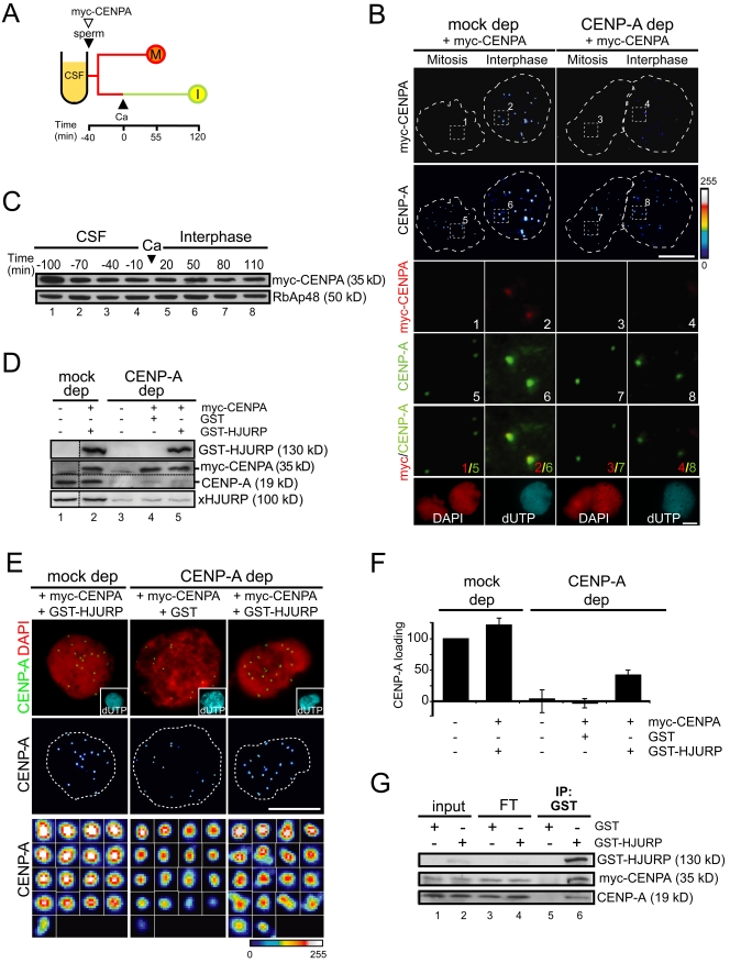 Centromeric protein A (CENP-A) is the epigenetic mark of centromeres. CENP-A replenishment is necessary in each cell cycle to compensate for the dilution associated to DNA replication, but how this is achieved mechanistically is largely unknown. We have developed an assay using Xenopus egg extracts that can recapitulate the spatial and temporal specificity of CENP-A deposition observed in human cells, providing us with a robust in vitro system amenable to molecular dissection. Here we show that this deposition depends on Xenopus Holliday junction-recognizing protein (xHJURP), a member of the HJURP/Scm3 family recently identified in yeast and human cells, further supporting the essential role of these chaperones in CENP-A loading. Despite little sequence homology, human HJURP can substitute for xHJURP. We also report that condensin II, but not condensin I, is required for CENP-A assembly and contributes to retention of centromeric CENP-A nucleosomes both in mitosis and interphase. We propose that the chromatin structure imposed by condensin II at centromeres enables CENP-A incorporation initiated by xHJURP.