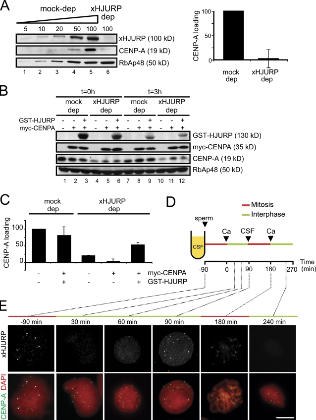 Figure 5. xHJURP is required for CENP-A deposition. (A) Left, immunoblot analysis of increasing amounts of a mock-depleted extract (5â100% of a 1.5-µl aliquot, lanes 1â5) and a 1.5-µl aliquot of an xHJURP-depleted extract (lane 6). Right, graph showing the loading efficiency of CENP-A in an extract depleted of xHJURP. Data come from two different experiments. Bars represent mean ± SE. (B) Immunoblot analysis of mock-depleted and xHJURP-depleted extracts replenished or not with myc-CENP-A and GST-HJURP at the time of sperm addition (t = 0, lanes 1â6) and at the end of the experiment (t = 3 h, lanes 7â12). (C) Loading efficiency of CENP-A in the indicated extracts. Data come from two independent experiments. Bars represent mean ± SE. (D) Outline of the chromatin assembly reaction used to assess the localization of xHJURP throughout the cell cycle reproduced in the extract by successive additions of calcium and CSF extract. Sperm chromatin (800/µl) was added at time 0. The times at which aliquots were taken for analysis are indicated. (E) Immunofluorescent staining with anti-xHJURP (green), CENP-A (red), and DAPI (blue). White arrowheads point to HJURP signals that colocalize with CENP-A signals on CSF assembled chromosomes. Bar, 10 µm. |