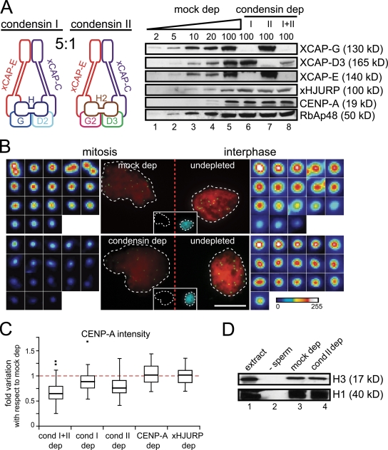 Figure 6. Condensin II prevents eviction of CENP-A nucleosomes from centromeres. (A) Left, subunit composition of the two condensin complexes. Right, immunoblot analysis of increasing amounts of a mock-depleted extract (expressed as percentage of a 1.5-µl aliquot) and extracts depleted of condensin I, condensin II, or both with the indicated antibodies. RbAp48 is shown as loading control. (B) Sperm chromatin was added to mock-depleted (top) and condensin-depleted (bottom) CSF extracts and incubated for 90 min. To serve as reference, sperm chromatin was added to an undepleted CSF extract, incubated for 40 min, and then calcium was added and incubation continued for 90 min. The latter samples (replicated interphase nuclei, as evidenced by the incorporation of biotin dUTP) were mixed with the former ones (mitotic chromosomes), centrifuged over coverslips, and stained with anti-CENP-A (green), DAPI (red), and streptavidin (cyan). Representative images of the photographed pairs are shown, with corresponding blown-up images of each individual centromere. (C) CENP-A signals in chromosomes assembled in depleted CSF extracts were measured in comparison with a reference sample, as described in B. The resulting numbers are expressed and plotted as fold variation relative to the average value obtained for the mock-depleted extract, arbitrarily set to 1 (red dotted line). Data from at least two independent experiments are shown for the depletion of condensins and from a single experiment in the case of CENP-A and xHJURP depletions. (D) Immunoblot analysis of chromatin fractions from assembly reactions in mock- and condensin II–depleted extracts. An aliquot of extract (lane 1) and a chromatin fraction from a mock assembly reaction with no sperm (lane 2) were also analyzed. |