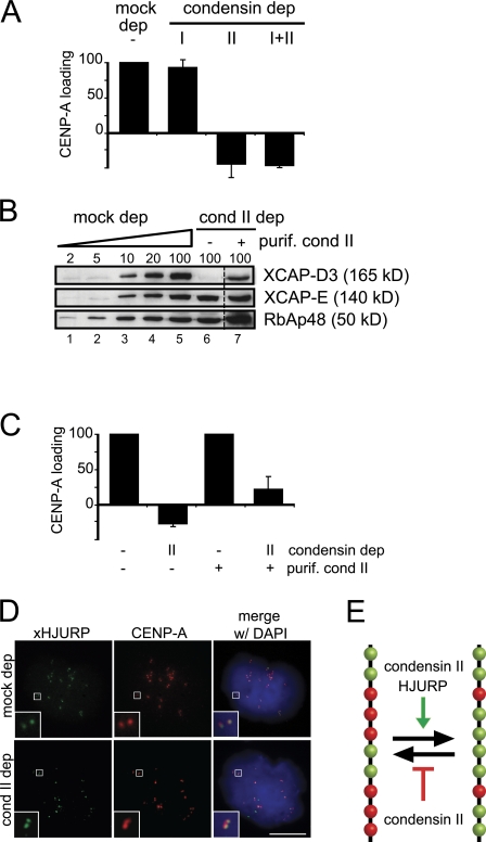 Figure 7. Condensin II is required for efficient loading of CENP-A. (A) Bar graph showing the CENP-A loading efficiency in the indicated extracts in two independent experiments. Bars represent mean ± SE. (B) Immunoblot analysis of increasing amounts of a mock-depleted extract (expressed as percentage of a 1.5-µl aliquot, lanes 1â5) and an extract depleted with anti-XCAP-D3 without (lane 6) or with 1:10 volume of affinity-purified condensin II (lane 7). (C) Bar graph showing the CENP-A loading efficiency in mock- and condensin IIâdepleted extracts with and without adding back purified condensin II. (D) Immunofluorescent staining of mitotic chromosomes assembled in mock- and condensin IIâdepleted extracts with antibodies against xHJURP (green) and CENP-A (red). DNA was counterstained with DAPI (blue). Bar, 10 µm. (E) Model to explain the role of xHJURP and condensin II in CENP-A dynamics. CENP-A and H3 nucleosomes are shown in green and red, respectively. Net incorporation of CENP-A will depend on the balance between addition of new CENP-A nucleosomes, a process in which xHJURP has a key role, and eviction of these nucleosomes. Condensin II prevents eviction of CENP-A nucleosomes but it is also required for their incorporation. |