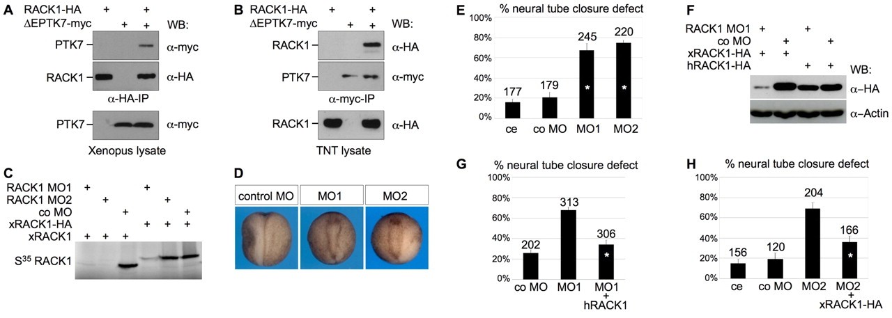 ???displayArticle.abstract??? RACK1 is an evolutionarily conserved intracellular adaptor protein that is involved in a wide range of processes including cell adhesion and migration; however, its role in vertebrate development is largely unknown. Here, we identify RACK1 as a novel interaction partner of PTK7, a regulator of planar cell polarity that is necessary for neural tube closure. RACK1 is likewise required for Xenopus neural tube closure. Further, explant assays suggest that PTK7 and RACK1 are required for neural convergent extension. Mechanistically, RACK1 is necessary for the PTK7-mediated membrane localization of Dishevelled (DSH). RACK1 facilitates the PTK7-DSH interaction by recruiting PKCδ1, a known effector of DSH membrane translocation. These data place RACK1 in a novel signaling cascade that translocates DSH to the plasma membrane and regulates vertebrate neural tube closure.
