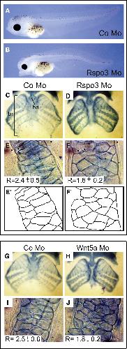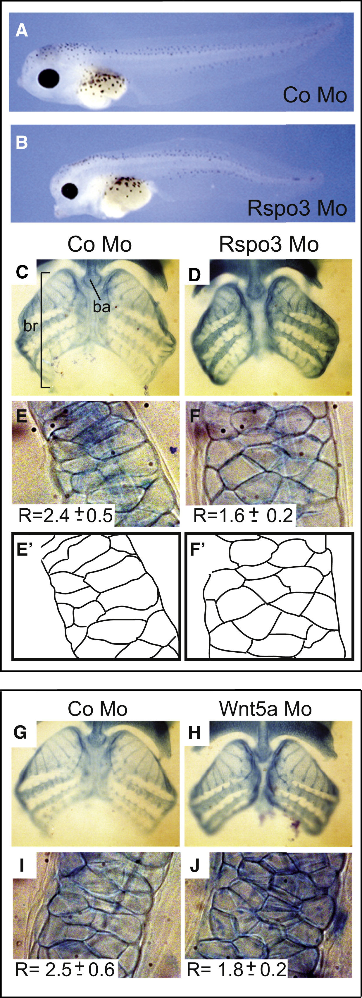 (A and B) Tadpole stage Xenopus embryos injected at 8-cell stage with 10 ng per embryo of Rspo3 Mo into the animal four blastomeres. Note reduced head in Rspo3 Morphants (68%, n = 98) compared to Co Mo (0.1%, n = 85). (C, D, G, and H) Ceratobranchial cartilage was stained with Alcian blue and dissected from stage 46 embryos injected at 8-cell stage animally with either 10 ng of Rspo3 Mo or 2.5 ng of Wnt5a Mo per embryo. Note compact cartilage elements. (E, F, I, and J) Ceratobranchial cartilage was dissected from Morpholino injected embryos and flattened. The length-to-width ratios (R) of chondrocytes were determined and are indicated. (Eâ² and Fâ²) Schematic drawing of cell outlines of (E) and (F). Abbreviations: br, ceratobranchial cartilage; ba, basihyal cartilage.