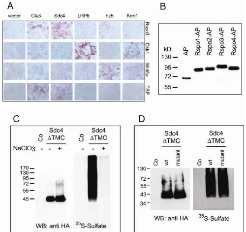 R-spondin 1-4 binding to syndecans 1-4. (A) Cell surface binding assay. Cells were transfected with indicated plasmids and conditioned media containing Wnt5A-V5 or AP-fusions of hRspo3, DKK1 and TSP domain of hRspo3 were applied for cell surface binding as indicated. (B) Integrity of Rspo-AP fusion proteins used in Fig. 1A was controlled using Western blot analysis with anti-AP antibody detection. (C) In vivo [35S] Sulfate metabolic labeling of N-streptag Sdc4 presence or absence of sodium chlorate. Samples were analyzed after streptavidin precipitation by Western blot (left)