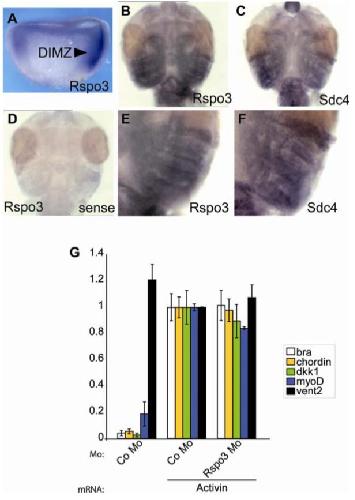 cartilage. (D) Sense probe for Rspo3 transcript gives no signal with stage 46 tadpole. (G) Expression profiles of the indicated mesodermal marker genes in animal caps injected with activin and Rspo3 Mo (40 ng per embryo). Data are shown with standard error of the mean is shown.