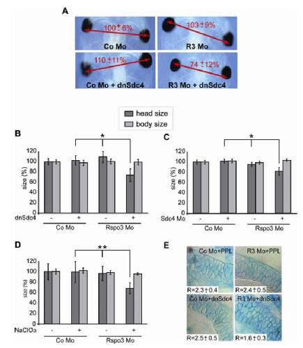 the 3rd power of head diameter. (B-C) Combined sub-threshold inhibition of Rspo3 and Sdc4 impairs head cartilage morphogenesis. Statistical analysis of embryos injected with low doses of Rspo3 Mo and/or dnSdc4 mRNA or 1 ng per embryo Sdc4 Mo. Note that head size was specifically reduced while the length of the body axis was unaffected. (D) Combined sub-threshold inhibition of Rspo3 and HSPG sulfation impairs head cartilage morphogenesis. Statistical analysis of embryos injected with Rspo3 Mo and/or treated with 60 mM NaClO3 between stage 20-46. Head diameter and head-tail body length are shown. Head size is significantly reduced by the inhibition of both Rspo3 and Sdc4 (p-values; *<0.005, **<0.01). (E) Ceratobranchial cartilage was dissected from Rspo3 Mo and/or dnSdc4 mRNA injected embryos in A and flattened. The length-to-width ratio (R) of chondrocytes is indicated. Data with standard error of the mean are shown.