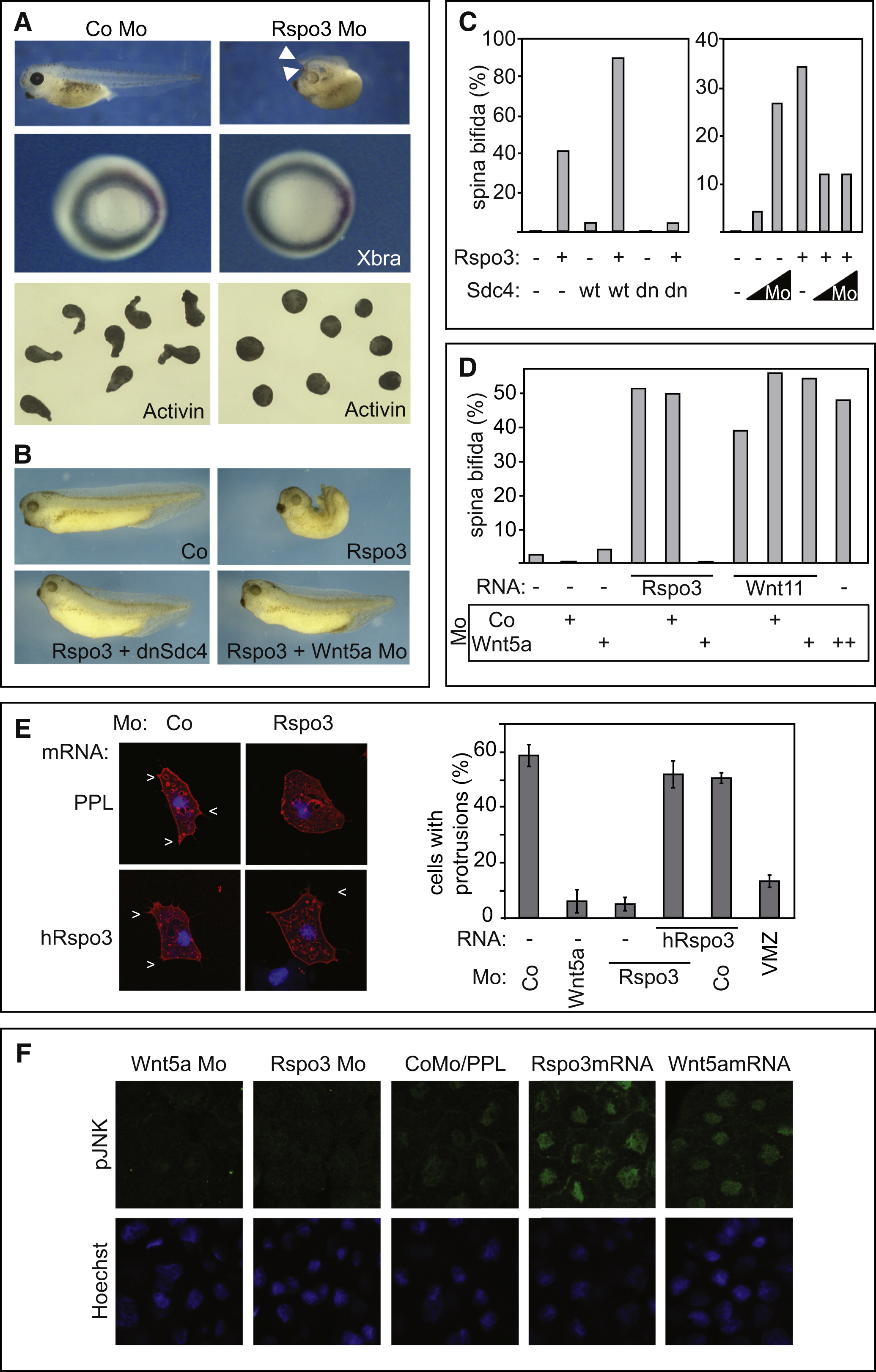 (BâD) Rspo3 signaling requires Sdc4 and Wnt5a to induce gastrulation defects. Embryos were injected into two dorsal blastomeres at 4-cell stage with Morpholinos and/or mRNA as indicated (40 ng Rspo3 Mo; 100 pg wild-type or dominant negative hSdc4 mRNA; 10 or 20 ng of Sdc4 Mo; 2.5 or 10 ng of Wnt5a Mo [â+,â and â++â]); 250 pg xRspo3 mRNA per embryo were used).