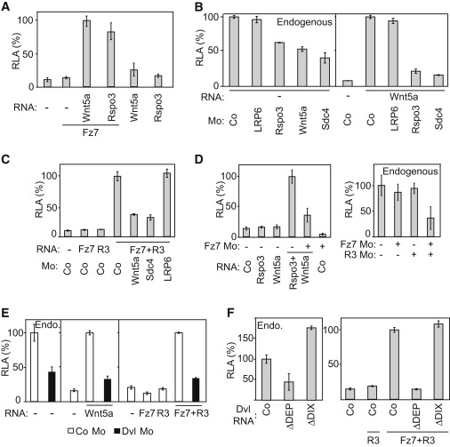 (AâF) ATF2-Luciferase reporter assay in Xenopus embryos. 4-cell stage embryos were injected equatorially with ATF2-Luc reporter and Renilla reporter plasmids and the indicated antisense Morpholinos and mRNAs. Luciferase reporter assays were performed from whole embryos harvested at gastrula stage (stage 12). Luciferase activity in embryos injected with either Co Mo only or Co Mo plus mRNA of the indicated activators within each conditions were set to 100%. RLA, relative luciferase activity. The mRNA and Mo doses for injections were (per embryo) as follows: Wnt5a mRNA (100 pg in A and D; 500 pg in B and E); xRspo3 (250 pg) and Rspo3 Mo (20 ng in B, 5 ng in D); and Wnt5a Mo (5 ng), Sdc4 Mo (20 ng), and Fz7 Mo (20 ng D left, 5 ng D right). Part of the data in (E) and (F) are from Ohkawara and Niehrs, 2011. Data with standard error of the mean are shown.