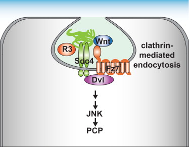 Endocytosis of Wnt receptor complexes is essential for Wnt/PCP signal transduction. Rspo3 binding to Sdc4 promotes clathrin-mediated endocytosis of the Wnt receptor complex and thereby signaling via the PCP pathway.