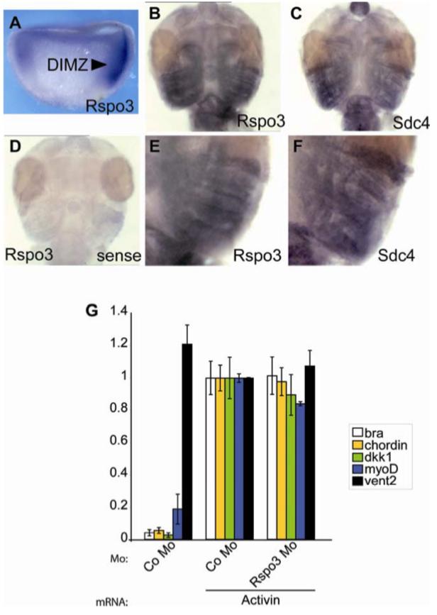 (A-F), Expression of Rspo3 and Sdc4 in Xenopus embryos. (A) Rspo3 expression in dorsal involuting marginal zone (DIMZ) of stage 10 sagitally bisected gastrula and (B,E) stage 46 tadpole head cartilage. (C, F) Sdc4 expression in stage 46 tadpole head