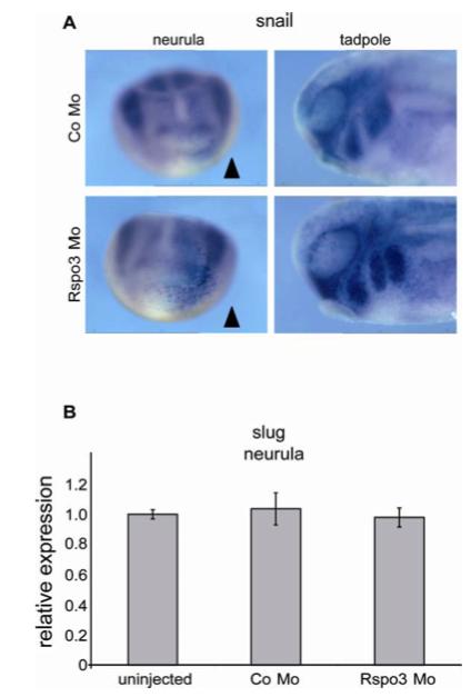hybridization (A) or by qPCR (B). Rspo3 Mo-injected embryos show unaffected snail expression patterns (95%, n=20 for neurula and 95.5%, n=22 for tailbud) as Co Mo-injected embryos (100%, n=21 for neurula and 100%, n=20 for tailbud). Data with standard error of the mean are shown.