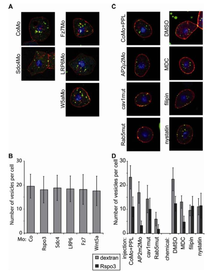 indicated Morpholinos or mRNA (A, B) or treated with indicated inhibitor (C, D). Animal cap cells were pre-treated with either DMSO, monodansylcadaverine (MDC), filipin III or nystatin for 45 minutes and incubated with Fluorescein-Dextran and the indicated inhibitors. Bars show the average number of fluorescent vesicles (excluding surface signals) for hRspo3ΔC-SNAP549 protein or Fluorescein-Dextran per cell. Error bars indicate standard deviation of the mean from 3 independent experiments. The scored number of cells are over n>40 (B) and n> 48 cells (D). Nuclear Hoechst staining, blue.