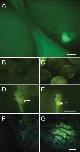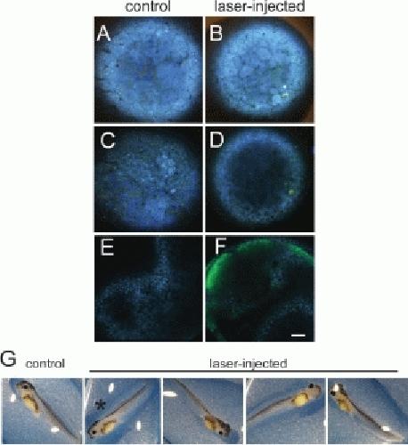 Figure 4. Low and high power views of embryos after laser injection with QDs. (A) An uninjected (left) and laser-injected (right) embryoright after injection. (B) Control- and (C) laser-injected embryos photographed at the early gastrula stage, â¼8 h after injection. (D) Control- and (E) laser-injected embryos photographed at the tadpole stage, â¼3 d after injection. Note some nonspecific autofluorescence in the gut (arrows) of the control embryo but a higher level of fluorescence in the injected embryo. (F) Control- and (G) laser-injected embryos â¼2 days pf photographed in the gut region using the Nikon confocal microscope. Scale bars = 100 μm in A, F, and G and â¼1 mm in B âE. Under similar experimental conditions, four laser and one manually injected embryos with QDs were monitored and photographed, suggesting a higher level of fluorescence in the guts.