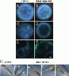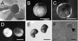 Figure 1. Low-power images of X. laevis embryos. (A) Four-cell embryo, 2 h pf. Embryo is being microinjected into one cell, a dorsal blastomere. (B) 32-cell embryo, 4 h pf. (C) Late blastula stageembryo, 9 h pf. (D) Gastrulating embryos, vegetal view (left), animal view (right), â¼14â15 h pf; (E) tailbud stageembryo prior to hatching, â¼24 h pf; (F) high-power view of embryo immediately after laser targeting for 1 s. Arrow indicates targeted region. In an experiment with 10 embryos, 80% of embryos targeted with similar settings as the measurement presented in Fig. 1 F survived through the swimming tadpole stage with no observable abnormalities. Scale bars = 1 mm (AâE), 100 μm (F).