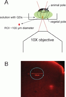 Figure 3. Delivery of QDs X. laevis embryos via NIR. (A) Schematic of laser targeting approach. Embryos in a dish containing a solution of QDs were first scanned at low power (700 nm; 10–12% intensity) to target a single cell in the vegetal pole since this side faces down and the incident laser comes up through the bottom of the dish. A ROI of 100 μm was then targeted for 1 s at 700 nm. (B) Low-power scan of an embryo showing the ROI. A 660 nm reflector, which only reflects wavelengths >660 nm, were used.