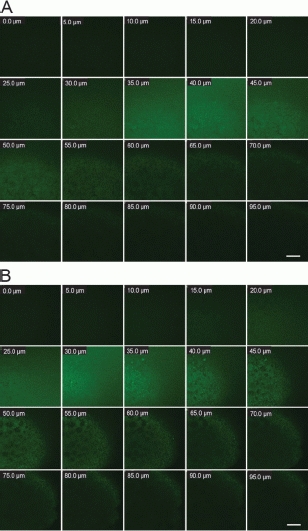 Figure 5. Z-stack series to visualize QDs in laser-targeted embryos. QDs were delivered to embryos at the 32–64-cell stage, and embryos were imaged using the Zeiss LSM at the 32–64 cell stage. Uninjected (A) and laser-targeted (B) embryos were imaged at 5 μm intervals through a 100 μm section in the center of the embryo. The Z-Stack images presented here demonstrate an example of six embryos injected by QDs, using the NIR pulses, under similar experimental conditions.