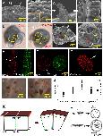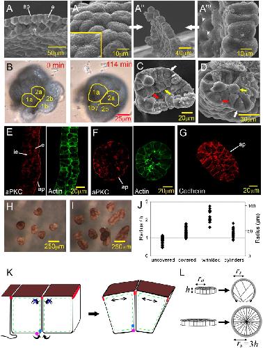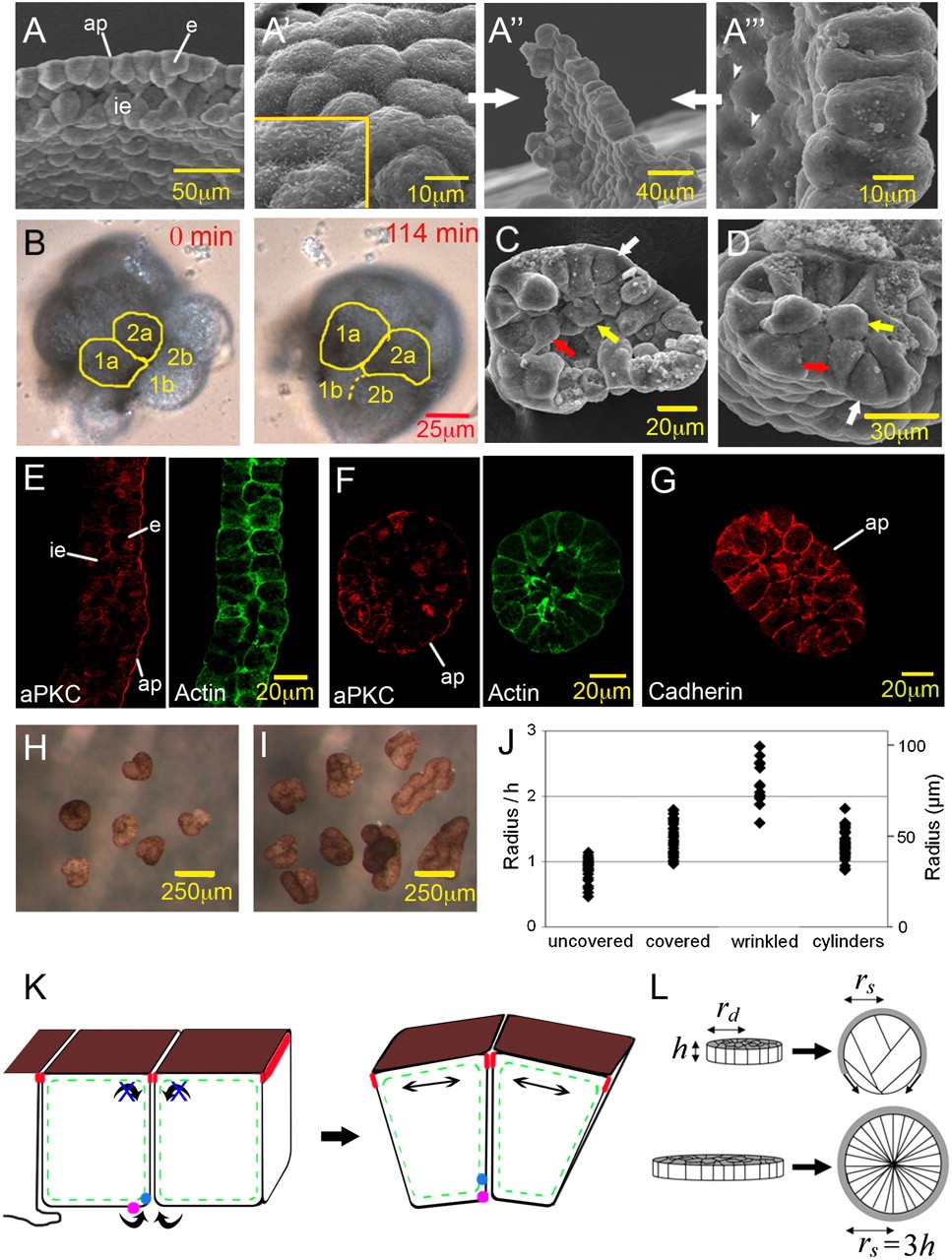 Folding of epithelial patches. (A) SEM picture of ectoderm with epithelial (e) and inner ectoderm (ie) layer; ap, apical surface. (A′�A′′′) Epithelial patch immediately after isolation. (A′) apical surface; (A′′) lateral view; (A′′′) basal surface with loosely connected cells and protrusions (arrowheads). (B) The apical surface (pigmented) of two cells (outlined in yellow; 1a, 2a) expands during rounding up. Cells were followed frame by frame. Boundaries between basal parts of same cells (1b, 2b) are barely discernible. (C) Fractured epithelial spherule, with wedge-shaped cells (white arrow), bottle cell (red arrow), and central cells (yellow arrow). (D) Fractured cylindrical wrinkle, arrows as in C. (E) Sectioned ectoderm double stained with antibody against aPKC (red) and actin (green). (F) Epithelial spherule stained as in E. (G) Spherule stained with C-cadherin antibody. (H) Explants above 66 μm radius wrinkle into connected spheres. (I) Even larger explants wrinkled into bent cylinders. (J) Explant structure and explant size. To determine critical sizes, patches were cultured for 4 h and scored for being completely or incompletely covered or wrinkled. Transition between incompletely (n = 32) and fully covered (n = 33) at a radius of 37 μm is shown. Onset of wrinkling, n = 14; radii of cylinders, n = 57. Horizontal lines are at multiples of epithelial height. (K) Cells of a folding sheet, with apical (brown) and lateral and basal (white) surfaces, subapical junctional complex (red), and actin cortex (green). Arrows and magenta/blue dots indicate movement of basal surface, and double arrows show apical expansion. (L) Patch size and spherule size. The apical side of the single-layered patch is shaded. Extreme cell elongation (at r = 3h) is avoided by wrinkling.