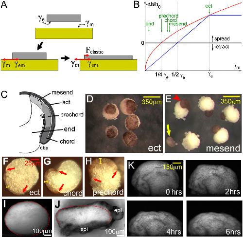 Spreading of epithelial patches. (A) Surface tensions and elastic force during spreading. Gray, epithelium; yellow, mesenchyme. γe, epithelial; γm, mesenchymal surface tension; γem, interfacial tension. (B) Mesenchymal surface tension and epithelial spreading (Eq. 1), with interfacial tension estimated according to Eq. 2 (blue) or Eq. 3 (red). (C) Regions of embryo: mesend, leading edge mesendoderm; ect, ectoderm; prechord, prechordal mesoderm; end, endoderm; chord, chordamesoderm; dbp, dorsal blastopore. (D and E) Patches spread on inner ectoderm (D) or retract (E) (arrowhead) or detach (arrow) on mesendoderm. (F�H) Epithelial patches (between red arrows; yellow bar, thickness) on mesenchymal explants, fixed after 3 h, and transected. (I�K) Surface tension of coated explants. Transected inner ectoderm explant after 5 h of flattening is shown without (I) or with (J) excess epithelial (dark; epi) coating. Red, Laplacian contour fit to explant. (K) Time course of flattening of epithelium-coated inner ectoderm, lateral view.