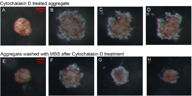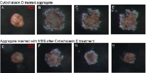 Fig. S3. Effect of 0.5 μM cytochalasin D on elasticity. In preliminary experiments that explored a range of concentrations (0.2�10 μM), 0.5 μM was found to be effective in our experiments without strongly affecting explant integrity. (A�D) Continuous incubation in cytochalasin D: rounded epithelial explant at the onset of cytochalasin treatment, before compression (A), after 1 h of compression before (B) and directly after (C) lifting of coverslip, and 1 h after removing coverslip (D). Four of five explants behaved as shown. (E�H) Pulse treatment with cytochalasin D: rounded explant at onset of cytochalasin incubation, before compression (E); after 1 h of cytochalasin D treatment followed by 1 h of washing in MBS, directly before (F) and after (G) lifting of coverslip; and 1 h later (H). Five of five explants showed this behavior. A second independent experiment gave similar results.