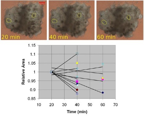 Fig. S4. An explanted epithelial patch can be cultured in Ca2+- and Mg2+-free MBS for prolonged times without dissociation into single cells (in contrast to EDTA-containing buffer). Explants are uneven and cells tend to move slowly in and out of focus. Nevertheless, the areas of 10 cells were followed from t = 20 min to either t = 40 min or t = 60 min. Apical areas were fit to straight lines in time; the average of the fitted slopes was not significantly different from zero (P = 0.20); i.e., there was no significant overall change in cell area.