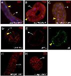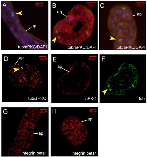 Fig. S1. Immunostaining of sectioned ectoderm and epithelial explants. (A�C) Ectoderm or epithelial explants stained with aPKC antibody (red) to indicate apical surface (ap), tubulin antibody (green) showing microtubules, and DAPI to reveal nuclei or chromosomes (blue); viewed in fluorescence microscope. (D�F) Epithelial explants stained for aPKC (red) and tubulin (green), viewed in a confocal microscope. (E and F) Same explant as in B in red and green channels, respectively. Orientation of mitotic spindles (yellow arrowhead): A, B, and F, parallel to apical surface; C and D, perpendicular or oblique to surface. (G and H) Staining of ectoderm (G) or epithelial explant (H) with an integrin antibody shows lack of integrinβ1 on apical (ap) surfaces and expression on all other membranes.