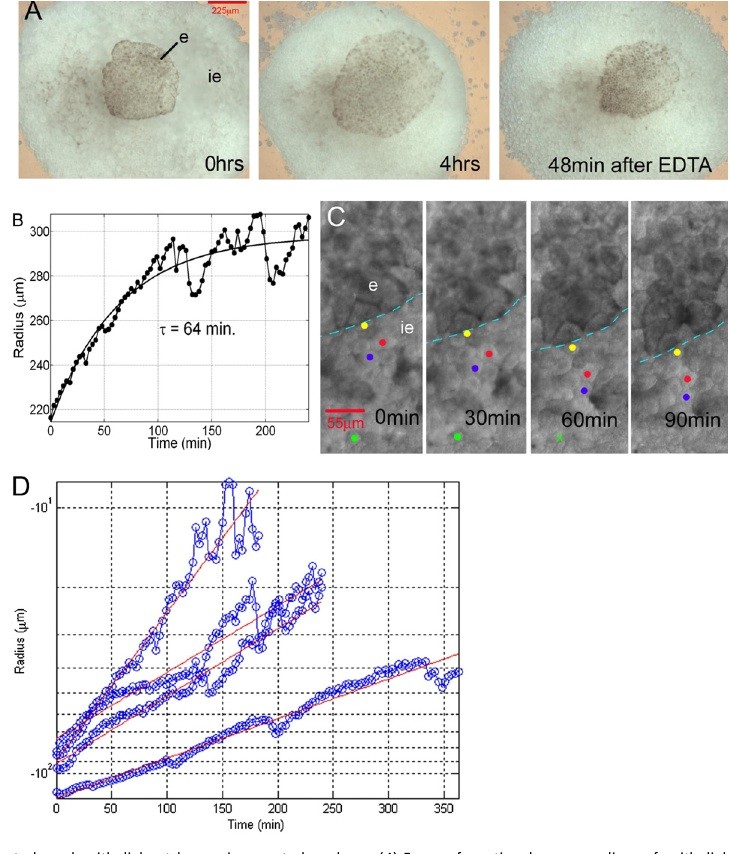 Fig. S5. Spreading of ectodermal epithelial patches on inner ectoderm layer. (A) Frames from time-lapse recordings of epithelial patch (center, brown) on inner ectoderm (white) at beginning and end of spreading and after subsequent EDTA treatment. (B) Time course of spreading; τ, time constant. (C) Spreading occurred by intercalation of inner cells; inner cells ahead of the advancing front of epithelial cells moved with the epithelium rather than being overtaken by it. (D) Exponential spreading. The logarithm of the equivalent radius as a function of time is shown for four explants (blue). The curves do not deviate sys- tematically from the straight lines fitted to them (red). Differences in slopes reflect natural variation (Table S1).