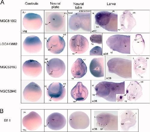 Figure 5. Whole mount in situ hybridization assays illustrating the expression patterns of 5 genes that are down-regulated by FoxD4L1/D5. Abbreviations are the same as in Figure 4. A: Down-regulated, validated genes of unknown function. Gastrula stages are side views oriented with animal pole to the top and vegetal pole to the bottom. Transcripts for all 4 genes are detected in the animal cap ectoderm. At neural plate stages, embryos are oriented in an anterior frontal view, with dorsal to the top. MGC81002 is weakly detected in the neural plate, the ectoderm bordering it, and epidermis (epi). At neural tube stages, it is detected diffusely in the neural tube, retina and epidermis. Side view. At larval stages, MGC81002 is additionally detected in the otocyst and branchial arch mesoderm. Side view and transverse sections. At neural plate stages, LOC443682 is strongly expressed in the epidermis, the ectoderm bordering the neural plate, and the anterior neural ridge (anr). At neural tube stages, LOC443682 is detected throughout the epidermis, with enhanced expression bordering the retina, hatching gland (hg), and cement gland. Left embryo is a dorso-anterior view with anterior to the bottom; top right embryo is a dorsal view of the head with anterior to the left, and bottom right embryo is a ventral view of the head with anterior to the top. At larval stages, LOC443682 is detected throughout the epidermis, most strongly on the dorsal side, and in the nephric mesoderm. Side view and transverse sections. At neural plate stages, MGC53193 is detected in the epidermis, border of the neural plate, and anterior neural ridge. At neural tube stages, MGC53193 is strongly expressed in the head epidermis and tissue surrounding the cloaca (cl). Left embryo is a frontal view with dorsal to the top and right embryo is a ventral view with posterior to the left. At larval stages, MGC53193 is weakly detected in the epidermis of whole mount embryos (side view), but transverse sections reveal additional weak expression in brain (b), lens, otocyst, and anterior pharynx (ph). At neural plate stages, MGC52940 is strongly expressed in the ectoderm bordering the neural plate and cement gland, and weakly in the epidermis. At neural tube stages, MGC52940 expression is pronounced in a dorsal midline stripe in the epidermis, surrounding the retinas, in a patch over the forebrain (between the retinas), and in the cement gland. Anterior-frontal view with dorsal to the top. At larval stages, MGC52940 is highly expressed in the olfactory placode and in cells dotted throughout the epidermis; it is weakly expressed in the cement gland and anterior pharynx. Side view and transverse sections. B: Expression pattern of Xenopus Elf-1. Elf-1 is weakly expressed in the animal cap ectoderm at gastrulation, throughout the neural plate and border zone, and then is barely detectable in the anterior neural tube (*). At larval stages it is weakly detected in the brain, lens, and branchial arch mesoderm (side views and transverse sections). |