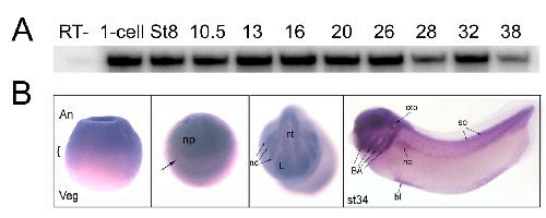 Supporting Figure S1: Expression pattern of BG161338 (eif5b) , which was up-regulated in the microarray assay, but not validated by RT-PCR or ISH assays. A: RT-PCR analysis of unmanipulated embryos shows that BG161338 is highly expressed at all developmental stages investigated. B: ISH analysis shows that at gastrula stages, BG161338 is expressed in the animal cap ectoderm (an) and the marginal zone (bracket) that will give rise to mesoderm; side view with animal to the top. Veg, vegetal pole. At neural plate stages, it is strongly expressed in the neural plate (np) and the ectoderm bordering the neural plate (arrow); anterior view with dorsal to the top. At neural tube stages, it is strongly expressed throughout the neural tube (nt), in the migrating neural crest (nc), and in the lens (L); anterior view with dorsal to the top. At larval stages, it is additionally expressed in the otocyst (oto), branchial arch mesoderm (BA), somites (so), nephric mesoderm (ne), and ventral blood islands (bl); side view with anterior to the left. |