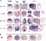 Figure 4. Whole mount in situ hybridization assays illustrating the expression patterns of 7 uncharacterized genes that are up-regulated by FoxD4L1/D5. Gastrula stages are side views oriented with animal cap (An) to the top and vegetal pole (Veg) to the bottom. Transcripts for all 7 genes are detected in the animal cap ectoderm. At neural plate stages, embryos are oriented in an anterior frontal view, with dorsal to the top. Transcripts for all 7 genes are detected in the neural plate (np) and in the ectoderm bordering the neural plate (arrow) that will give rise to the cranial placodes and neural crest. At neural tube stages, MGC132176 is expressed throughout the neural tube (nt), with intense staining in a band in the midbrain-hindbrain (hb) region, in adjacent neural crest (nc), and the dorsal rim of the cement gland (cg). Left embryo is a dorsal view with anterior at the bottom and right embryo is a ventral view of the head. At larval stages (st328), MGC132176 is detected throughout the brain and retina (r), in the lens (L), otocyst (oto), cement gland, branchial arch (BA), and nephric mesoderm (ne). This and all larval stages are side views with anterior to the left. Transverse sections of st38 embryo confirm the labeled tissues identified in whole mount embryos, and identify the profundal ganglion (Pg). At neural tube stages, LOC496224 is expressed throughout the neural tube, retina, and somites (so). Side view with anterior to the left. At larval stages, LOC496224 is additionally expressed in the lens, otocyst, and branchial arches. BC097640 is expressed throughout the neural tube, with strong expression in the pineal primordium (pin), cement gland, several cranial placodes (dlp, dorso-lateral placode; olf, olfactory placode; Vp, trigeminal placode), and scattered cells on the ventral midline (bracket) caudal to the cement gland. Left embryo is an anterior frontal view with dorsal to the top; right embryo is a ventral view with anterior to the top. At larval stages, BC097640 is additionally expressed in the lens, otocyst, branchial arches, head mesoderm (hm), heart (ht), ventral blood islands (bl), somites, and nephric mesoderm. At neural tube stages, BJ051730 is weakly expressed throughout the neural tube, with strong expression in the midbrain-hindbrain region and adjacent neural crest. Dorsal anterior-view from the top. At larval stages, BJ051730 is additionally expressed in the lens, otocyst, branchial arches, somites, and nephric mesoderm. At neural tube stages, BJ043686 is expressed in the neural tube and the ectoderm bordering it (bz). Side view with anterior to the left. At larval stages, BJ043686 is additionally expressed at low levels in the lens, otocyst, somites, branchial arch, head, and nephric mesoderm. At neural tube stages, CB983184 is expressed in the neural tube and the ectoderm bordering it. At larval stages, CB983184 is additionally expressed in the olfactory pit, lens, retina, otocyst, somites, branchial arch mesoderm, and heart. At neural tube stages, MGC68716 is expressed in the neural tube, the ectoderm bordering it, and pineal primordium. At larval stages, MGC68716 is additionally expressed in the otocyst, somites, branchial arch mesoderm, and heart. fb, forebrain; mb, midbrain. |